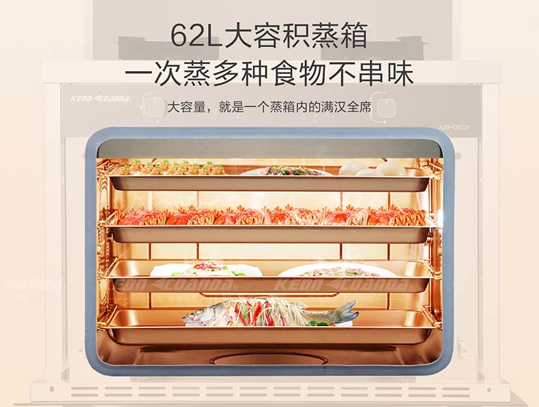 集成灶十大品牌、廚電行業(yè)十大品牌科恩D123X蒸烤消一體集成灶,擁有62L大容積內膽,內部設有多層蒸架,選用進口“薩萊米”陶瓷加熱盤,噴氣式4D立體蒸,噴氣升溫快,能迅速讓蒸汽達到腔內各個區(qū)域,從而實現(xiàn)無冷角均勻加熱,蒸汽快速升騰,縮短了加熱的時間,鎖住了營養(yǎng),實現(xiàn)食物的原汁原味,使烹飪更加鮮美!