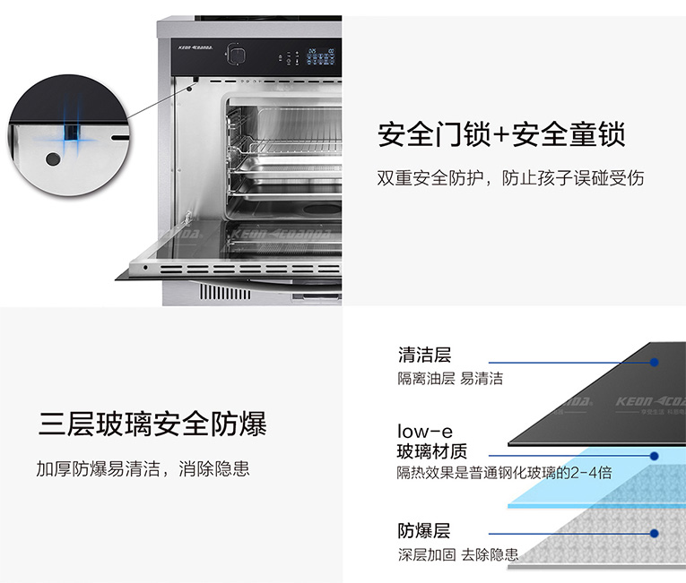 同時集成灶十大品牌、廚電行業(yè)十大品牌科恩蒸烤消一體集成灶蒸菜時也不會出現(xiàn)冷凝水滴落的現(xiàn)象,配備了蒸汽后排技術,蒸汽隨著風機自動排出,菜與菜之間不會串味,這樣出來的菜品也就色香味俱全!另外箱門還有多層高溫防護技術,在普遍的耐高溫鋼化玻璃基礎上,中間再置入一層Low-e玻璃材質,隔熱效果是普通鋼化玻璃的2-4倍,避免不小心燙傷皮膚。
