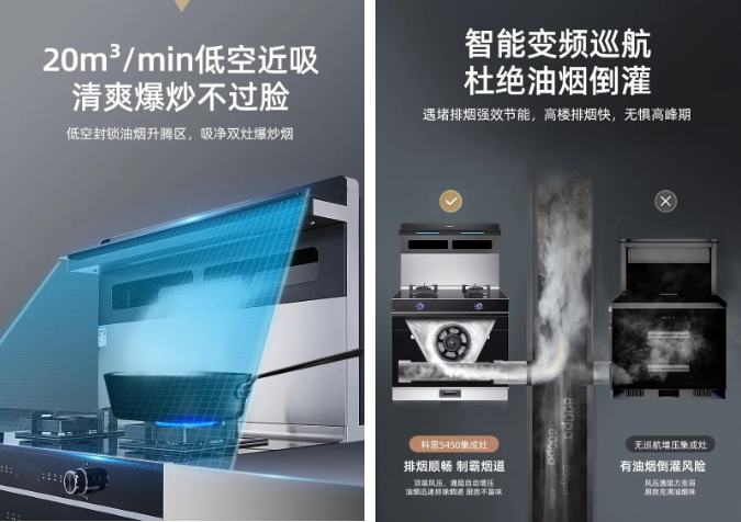 黏膩油煙是造成廚房高溫的罪魁禍首,封閉廚房加上爐火的燃燒,油煙擴散充斥著整個空間,又悶又熱,科恩S450以其低空近吸和20m3/min大吸力形成黃金攏煙區(qū),牢牢將油煙封鎖在擴散前的升騰區(qū),吸煙距離更近,把油煙扼殺在萌芽狀態(tài),完美解決油煙難題,油煙不發(fā)散,廚房溫度自然不會高!S450搭載智能變頻巡航系統(tǒng),最大風壓可達800Pa,高層以及做飯高峰期時,不再懼怕公共煙道油煙壓力,遇堵排煙強效節(jié)能,杜絕油煙倒灌,把油煙輕松排出室外,清新廚房空氣。
