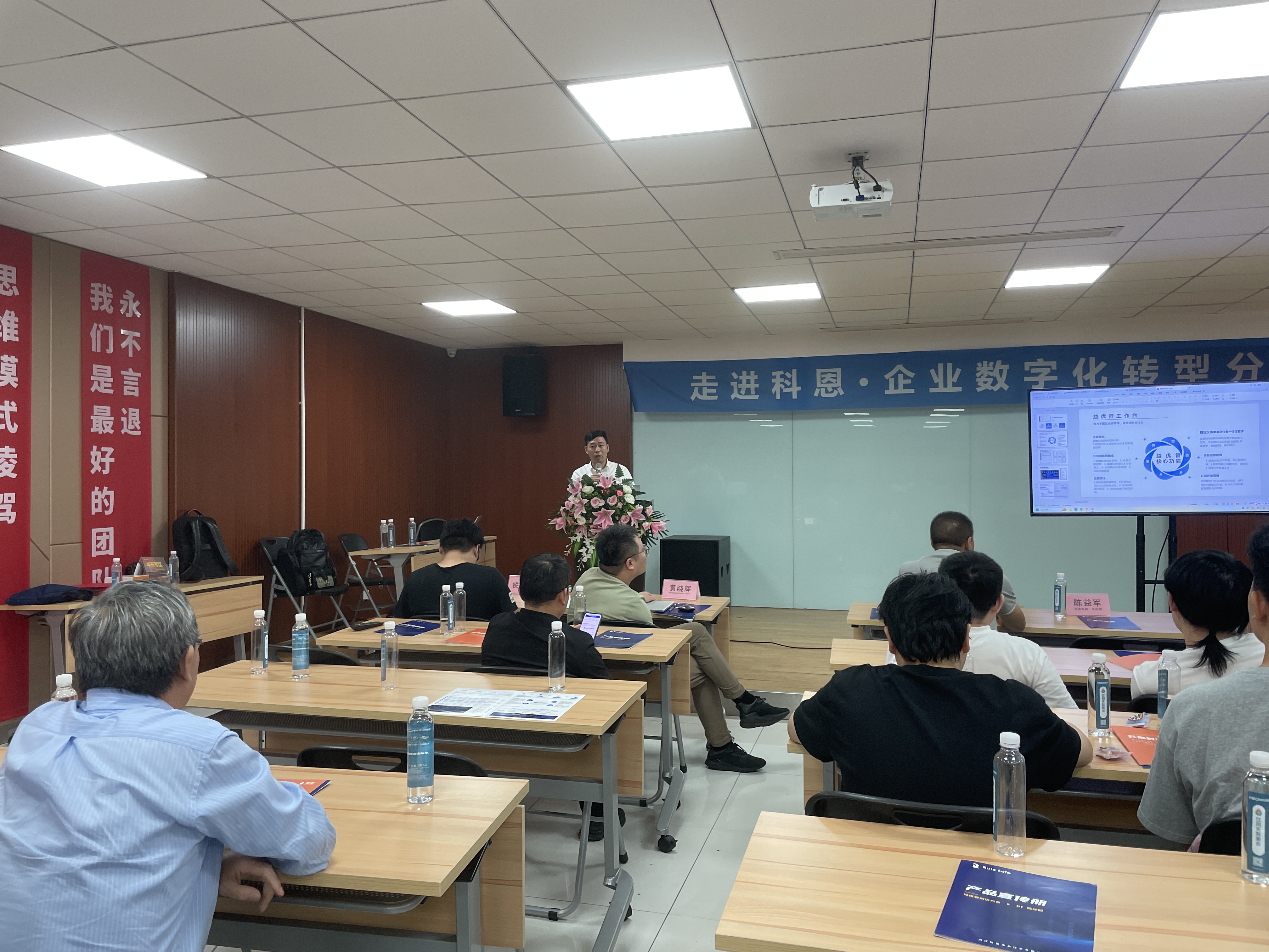 本次會議邀請到了:嵊州市數(shù)字經(jīng)濟促進會副會長--黃曉輝、企業(yè)數(shù)字化升級研究專家--黃涌忠、釘釘紹興區(qū)域負責人--胡哲平、科恩電器總經(jīng)理--陳益軍、銳智企業(yè)數(shù)字化方案實施專家--傅宏翔做重要分享。