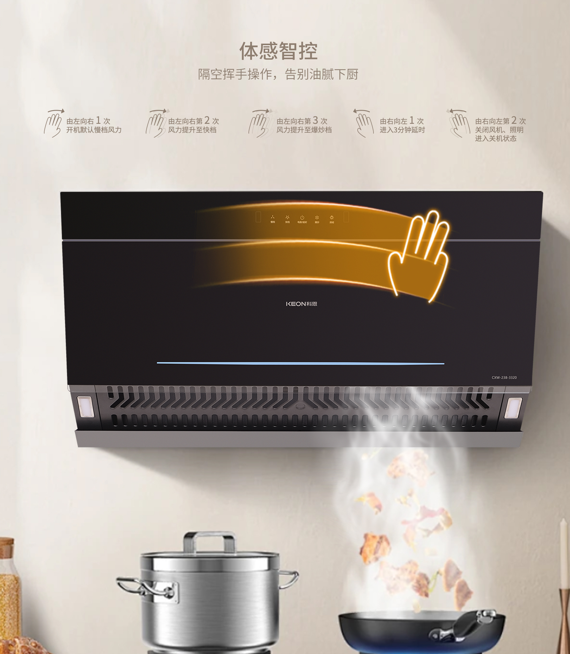 在功能模式上,科恩3320煙機擁有2檔吸煙模式和爆吸模式,可輕松切換,滿足不同烹飪場景的需求。