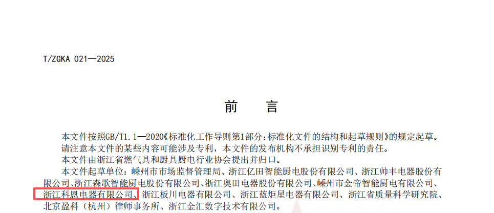 此次榮膺團標起草單位,是科恩十余載載譽前行的又一高光時刻。在榮譽殿堂中,高新技術企業認定與CNAS認可實驗室彰顯其科研實力;行業標準起草單位、集成灶團體標準起草單位、集成水槽標準參編單位等頭銜,“廚電行業十大品牌”“守合同重信用企業”等榮譽,印證其在標準制定領域的持續深耕,體現市場與社會的雙重認可。同時,作為中國五金協會、浙江省燃氣具和廚具廚電行業協會理事單位,科恩始終積極參與行業治理,用實際行動踐行領軍企業的責任擔當。