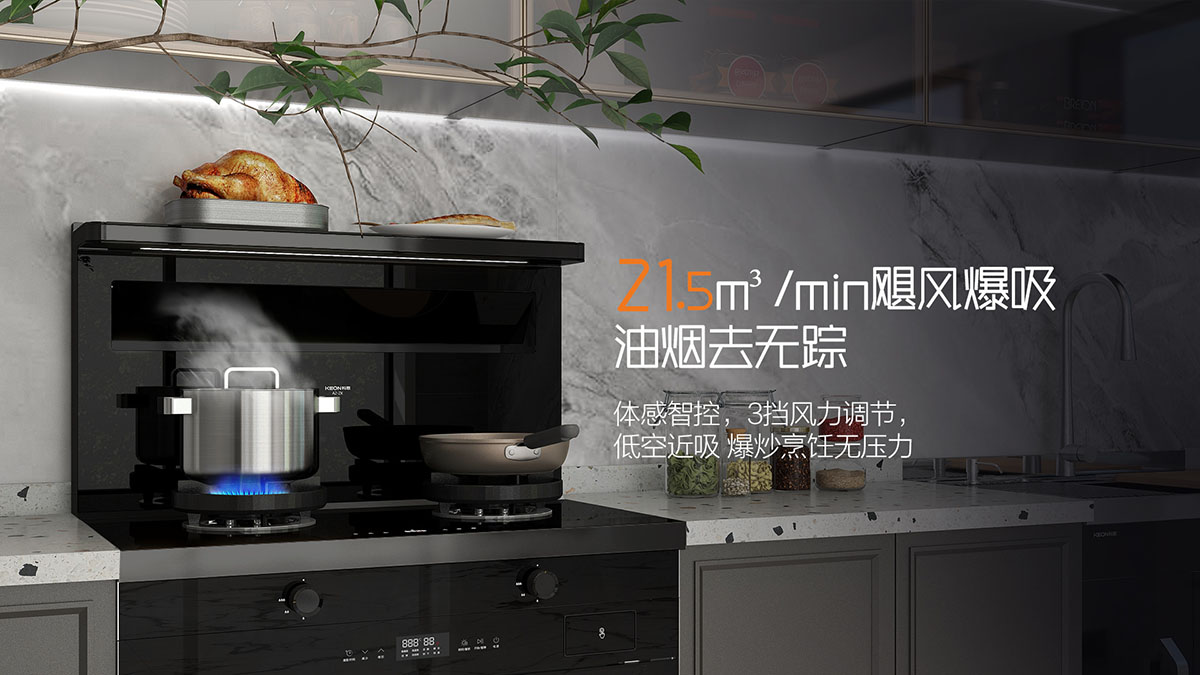 - 21.5m3/min寬域爆吸攏煙,油煙0逃逸
