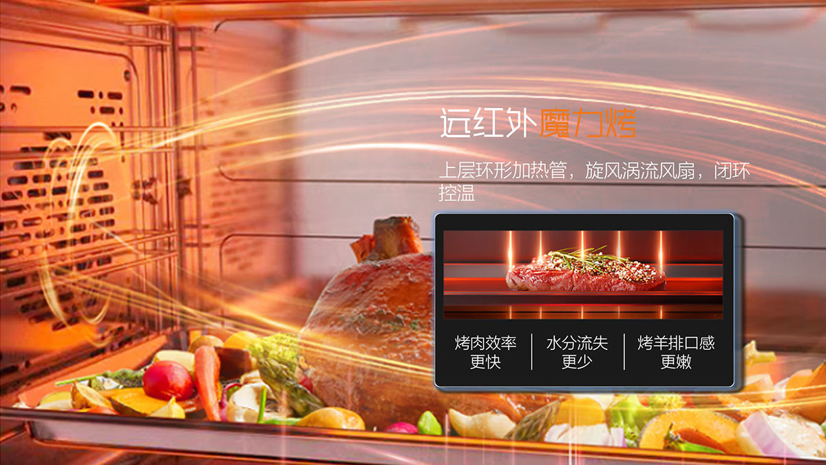 - 大容量蒸烤箱,120℃高溫快蒸,360〫立體炙烤