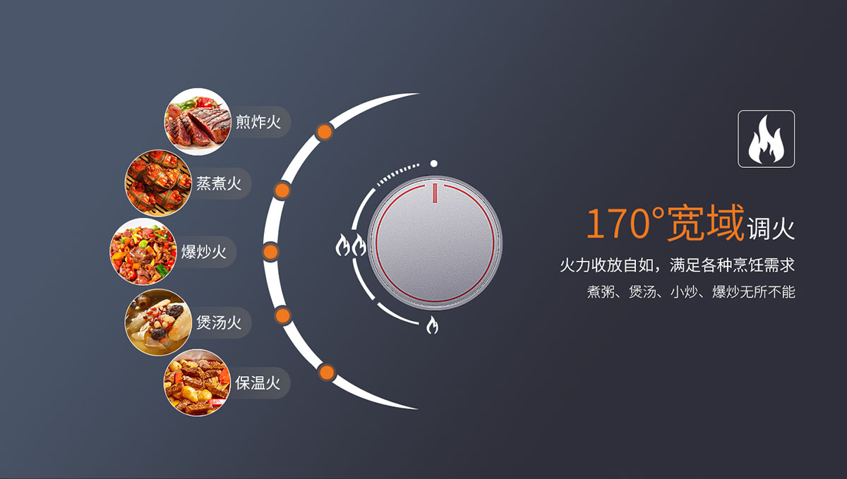 • 無極寬域調火,0°-170°收放自如,滿足各種烹飪火力需求