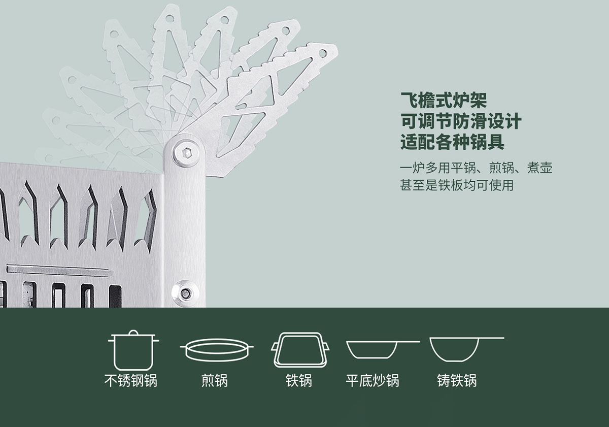 • 飛檐式可調節防滑鍋架,適配各種鍋具
